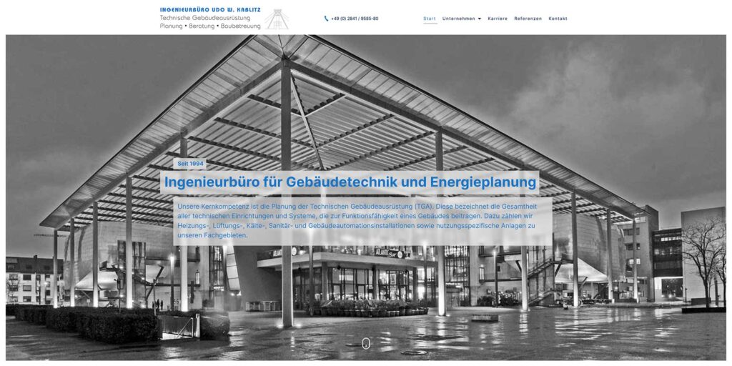 Moderne, leistungsstarke Website, die die Expertise des Ingenieurbüros Kablitz überzeugend zeigt und dank klarer Struktur und erweiterbarer Technik für zukünftiges Wachstum gerüstet ist.