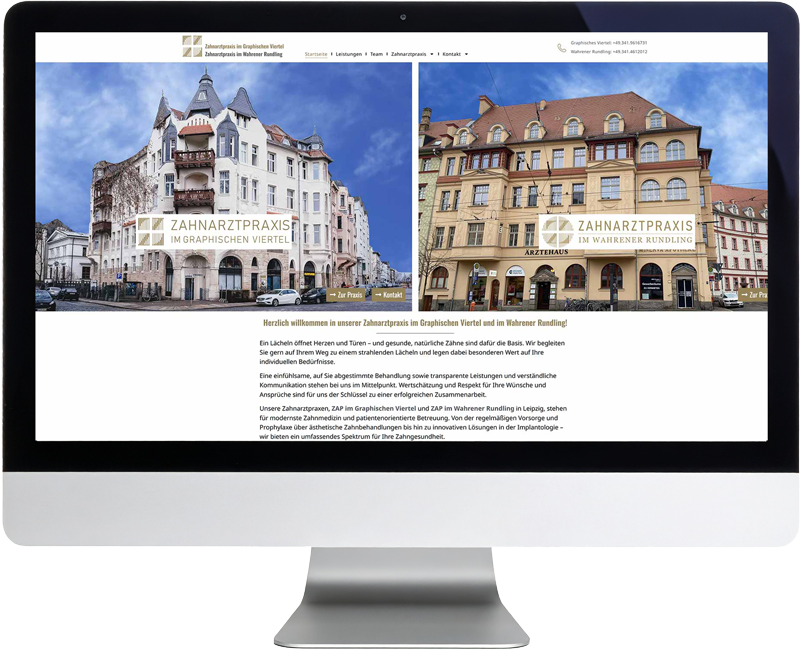 Entwicklung zweier benutzerfreundlicher, SEO-optimierter Websites, die Vertrauen schaffen, beide Praxen als kompetente Ansprechpartner in Leipzig positionieren und die lokale Auffindbarkeit verbessern („Zahnarzt Leipzig Graphisches Viertel“, „Zahnarzt Leipzig Wahrener Rundling“, „Implantate Leipzig“).