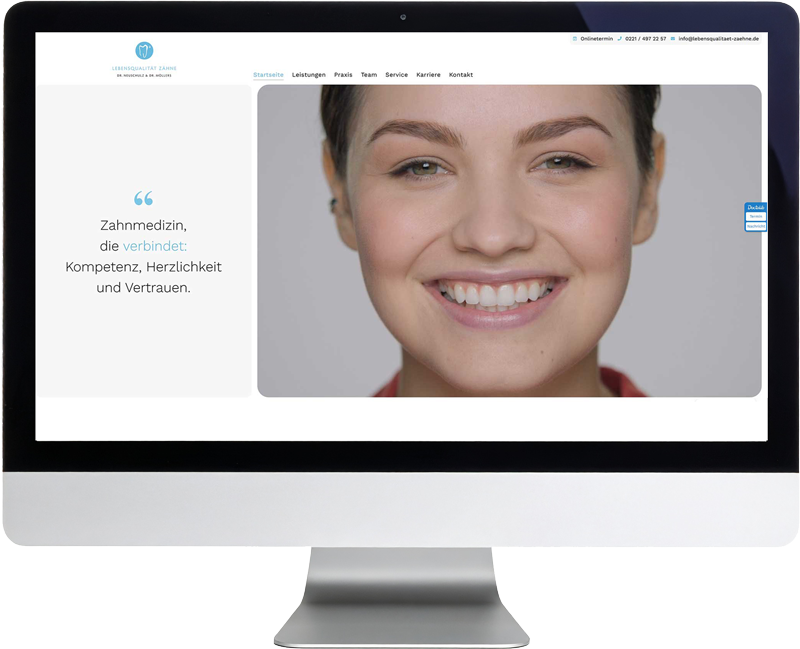 Konzeption und Umsetzung der Website der Zahnarztpraxis Lebensqualität Zähne in Köln-Braunsfeld – moderne Wohlfühlpraxis mit Schwerpunkten auf mikroskopischer Zahnheilkunde, Endodontie, Implantologie, ästhetischer Zahnmedizin und Prophylaxe.